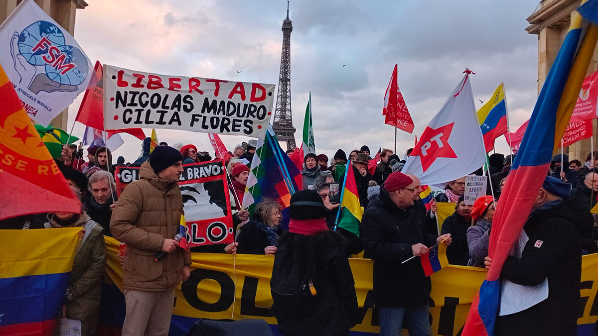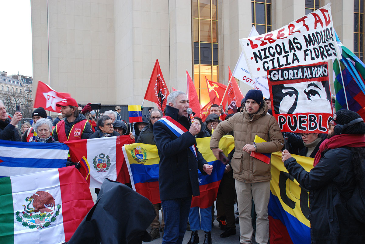 Une manifestation organisée le 10 janvier à Paris, au Trocadéro, par le Collectif international pour la paix au Venezuela – 36 organisations solidaires latino-américaines et africaines [26] – est boycottée par les notables « anti-impérialistes » et la « contra » [27] françaises. Au cours d’une réunion convoquée par le bureau politique de France Amérique latine, il est décidé que la CGT, sous l’autorité de sa secrétaire générale Sophie Binet, appellera à un rassemblement « unitaire » parallèle, à la même heure, à La Bastille, pour dénoncer l’intervention américaine, mais sans réclamer la libération du président vénézuélien.