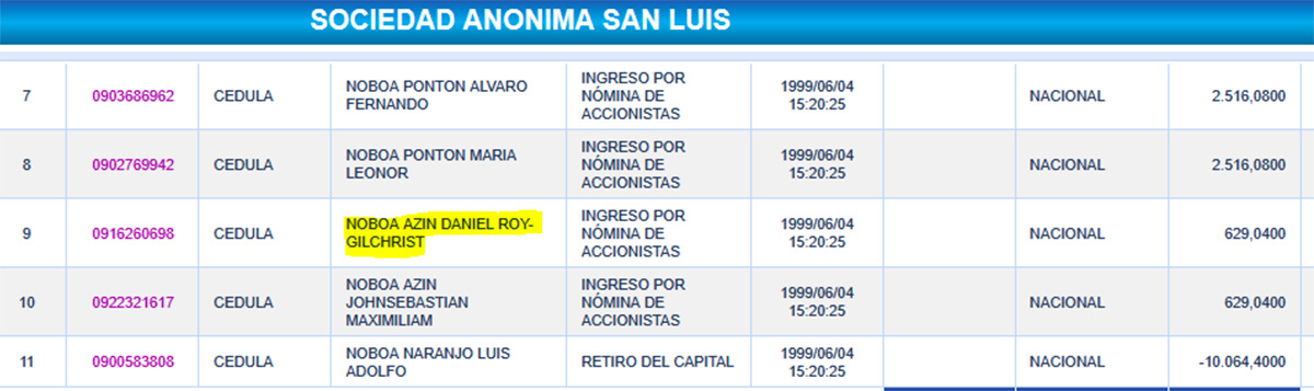 Le dossier de cette affaire « Cachorro » (du nom imprimé sur les paquets de « coke ») mentionne que de puissants véhicules civils blindés appartenant à la Corporation Noboa ont fréquemment été vus dans la « hacienda ». Fâcheux lorsqu’on se souvient qu’à cinq reprises, depuis 2020, des chargements de cocaïne ont été découverts (en Équateur en Italie, en Croatie et en Turquie) dans des navires dépendant de filiales de Lanfranco Holdings S.A. Cette entreprise offshore, dont le siège se trouve au Panamá, est actionnaire majoritaire (51 %) de Noboa Trading Co. Au bas mot, selon les sources, entre 600 kilos et 1,75 tonnes ont été saisies. Sachant que Lanfranco Holdings S.A. a pour copropriétaires deux frères dont le nom peine à passer inaperçu : Juan Sebastián et… Daniel Noboa.