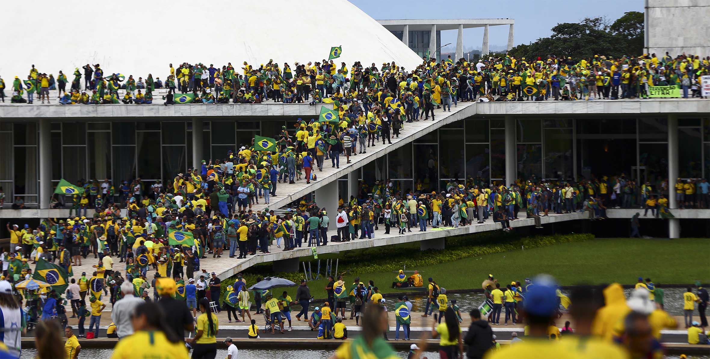 Illustration : Envahisseurs sur la rampe du Palais des Congrès. Marcelo Camargo / Agência Brasil – 8 janvier 2023 / Wikimedia CC