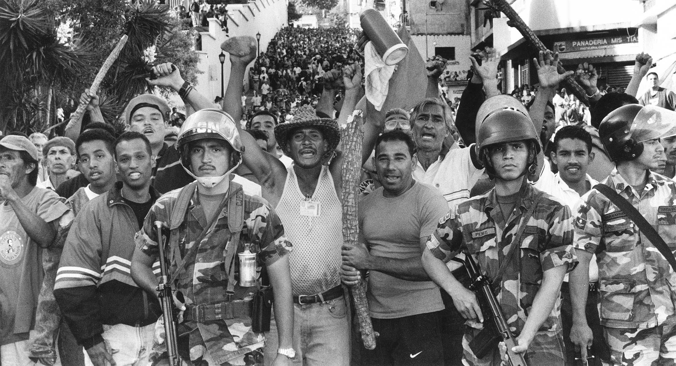 Prêtes à suivre n’importe qui, pour peu qu’il les débarrasse du « tyran », la droite, la droite de droite et l’extrême droite s’élancent vers l’ouest de la ville. Toutes les chaines privées de télévision filment et diffusent la progression sans discontinuer. Entre les mains du maire d’opposition Alfredo Peña, la Police métropolitaine ne s’oppose pas à la marche. Au contraire, elle lui ouvre le chemin et l’appuie. Les Uzi et pistolets 9 mm de certains de ces flics ne sont pas des armes réglementaires… Vice-ministre de la Sécurité, chef de la coordination de la police, le général Camacho Kaairuz fait partie de la conspiration !