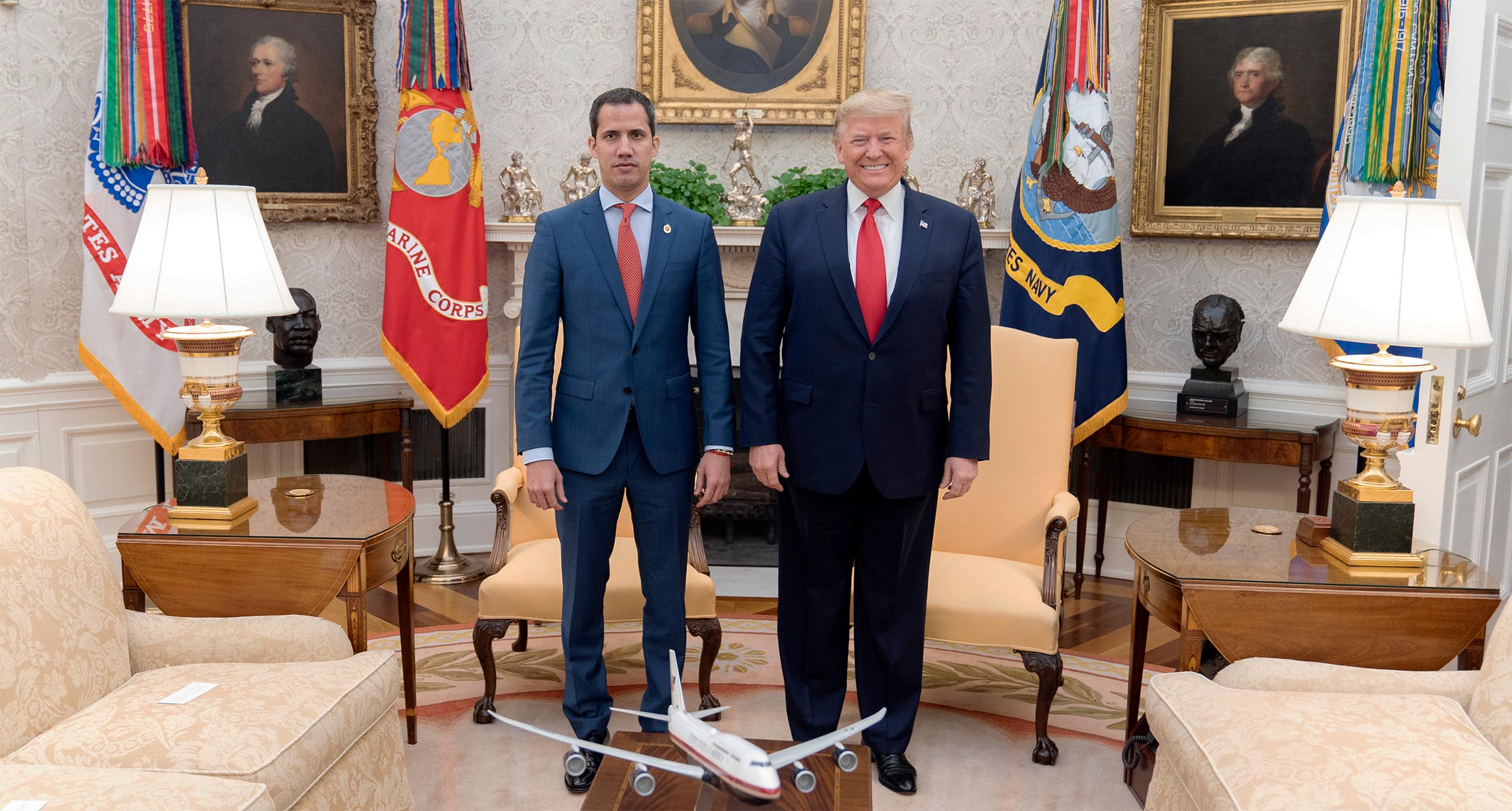 - De gauche à droite : Carlos Vecchio (« ambassadeur » aux Etats-Unis), Julio Borges (« ministre des Affaires étrangères) et Juan Guaido, président autoproclamé, avec le « boss », Donald Trump.